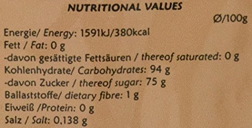 Herkunft: Thailand Energie: 1591 kJ/380kcal Fett 0g Kohlenhydrate: 94g davon Zucker: 75g Ballaststoffe: 1g Eiwei: 0g Salz: 0,138g