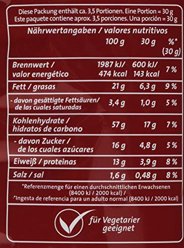 Zutaten: Maisgrieß (49 %), ERDNÜSSE (30 %), Zucker, Sonnenblumenöl, Speisesalz, natürliches Aroma, Karamellzuckersirup.Kann Spuren von SCHALENFRÜCHTEN enthalten.