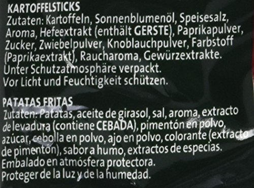 Kartoffeln, Sonnenblumenöl, Speisesalz, Aroma, Hefeextrakt (enthält GERSTE), Paprikapulver, Zucker, Zwiebelpulver, Knoblauchpulver, Farbstoff (Paprikaextrakt), Raucharoma, Gewürzextrakte.Unter Schutzatmosphäre verpackt.