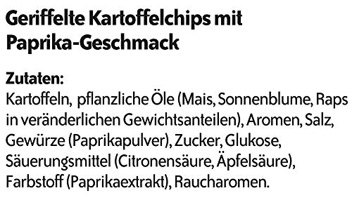 Zutaten: Kartoffeln, pflanzliche Öle (Sonnenblume, Raps in veränderlichen Gewichtsanteilen), Aromen, Salz, Gewürze (Paprikapulver), Zucker, Säuerungsmittel (Citronensäure, Äpfelsäure), Farbstoff (Paprikaextrakt), Raucharomen.