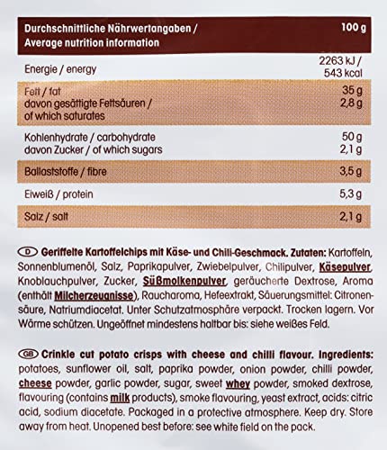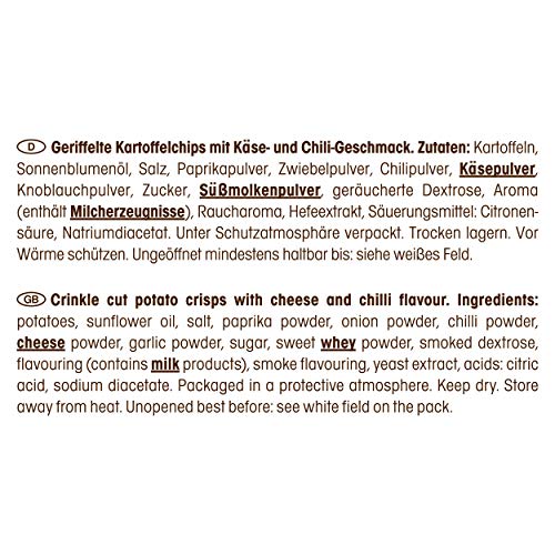 Zutaten: Kartoffeln, Sonnenblumenöl, Salz, Paprikapulver, Zwiebelpulver, Chilipulver, KÄSEPULVER, Knoblauchpulver, Zucker, SÜßMOLKENPULVER, geräucherte Dextrose, Aroma (enthält MILCHERZEUGNISSE), Raucharoma, Hefeextrakt, Säuerungsmittel: Citronensäure, Natriumdiacetat.