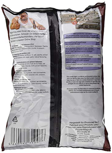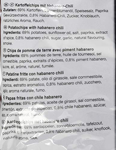 Zutaten: 69% Kartoffeln, Sonnenblumenöl, Speisesalz, Paprika, Gewürzextrakte, Habanero- Chili, Zucker, Knoblauch, natürliches Aroma, Rauch.