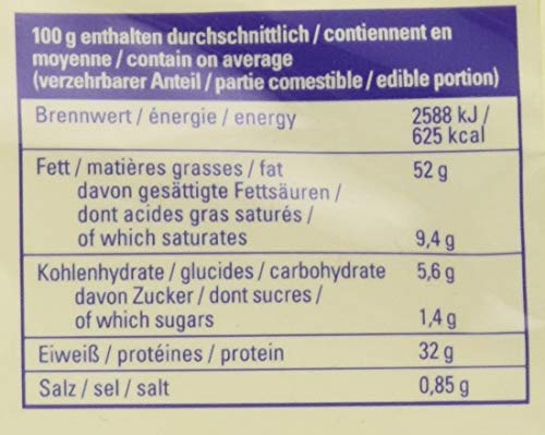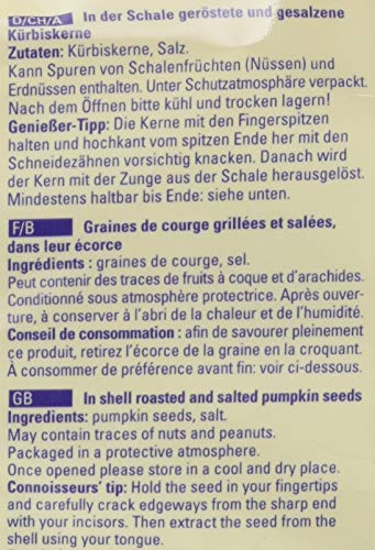 Zutaten: Kürbiskerne, Salz. Kann Spuren von Schalenfrüchten (z.B. Nüssen und Steinfrüchten) und Erdnüssen enthalten.