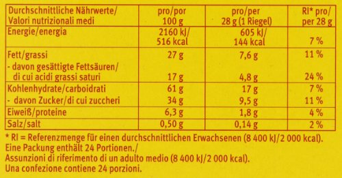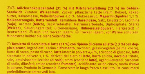 Zutaten : WEIZENMEHL, Zucker, Kakaobutter, Kakaomasse, Palmöl, VOLLMILCHPULVER, Glukosesirup, MAGERMILCHPULVER, BUTTERREINFETT, gemahlene HASELNÜSSE, Salz, Emulgator: Lecithine (SOJA); MOLKENERZEUGNIS, Backtriebmittel: Natriumcarbonate, Diphosphate; Aromen (MILCH), Stärke (WEIZEN), Säuerungsmittel: Citronensäure; HÜHNEREIGELBPULVER.
