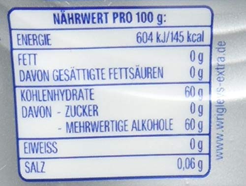 Zutaten: Kaumasse, Süßungsmittel Xylit, Sorbit; Verdickungsmittel Gummi Arabicum, Feuchthaltemittel Glycerin, Aromen, Füllstoff Calciumphosphate, Emulgator SOJALECITHIN, Süßungsmittel Aspartam, Acesulfam K; Säureregulator Natriumhydrogencarbonat, Überzugsmittel Carnaubawachs, Antioxidationsmittel Bha, Farbstoff E133.