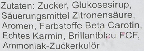 Zutaten: Zucker, Glukosesirup, Säuerungsmittel Zitronensäure, Aromen, Farbstoffe Beta Carotin, Echtes Karmin, Brillantblau FCF, Ammoniak-Zuckerkulör